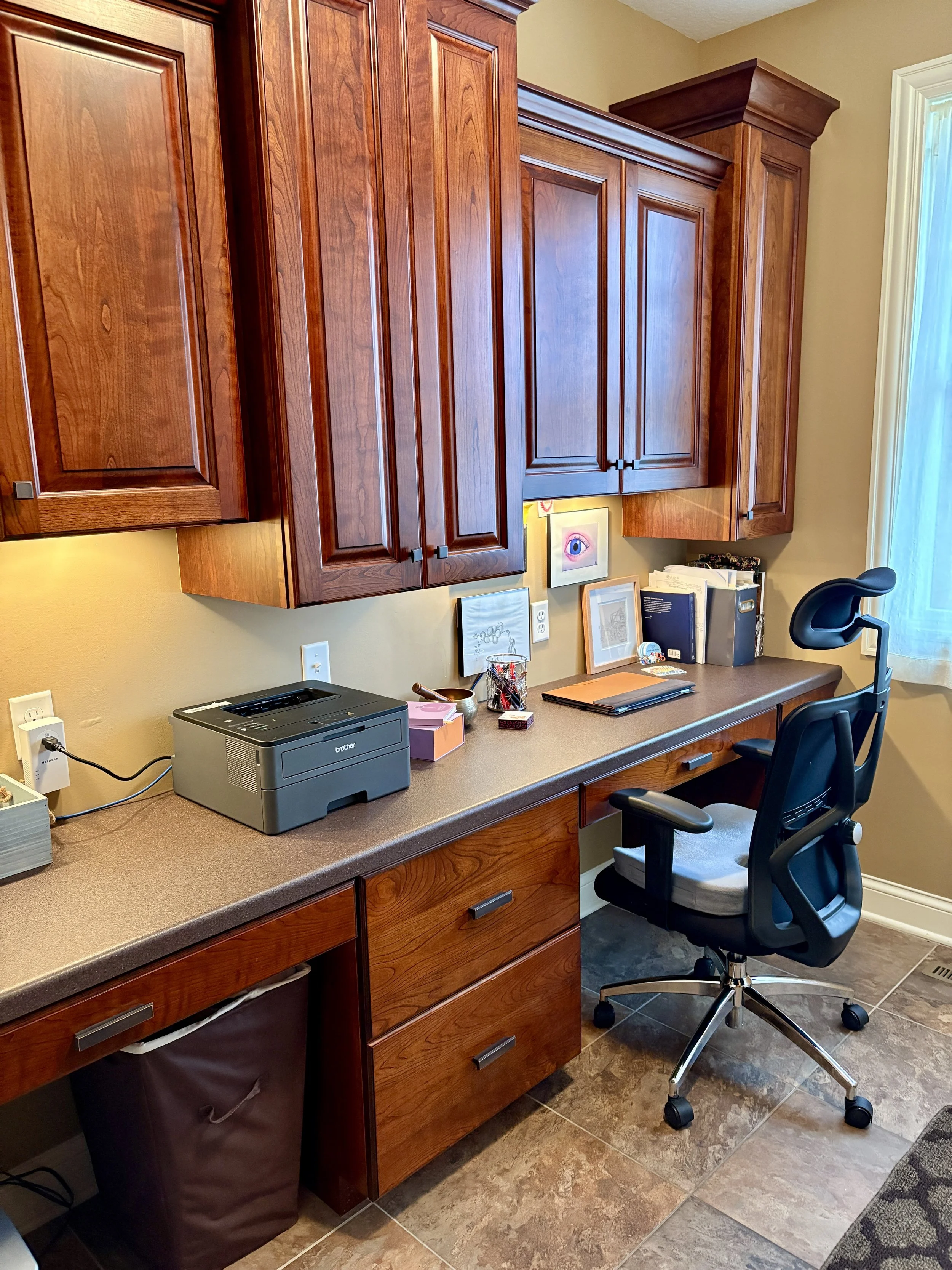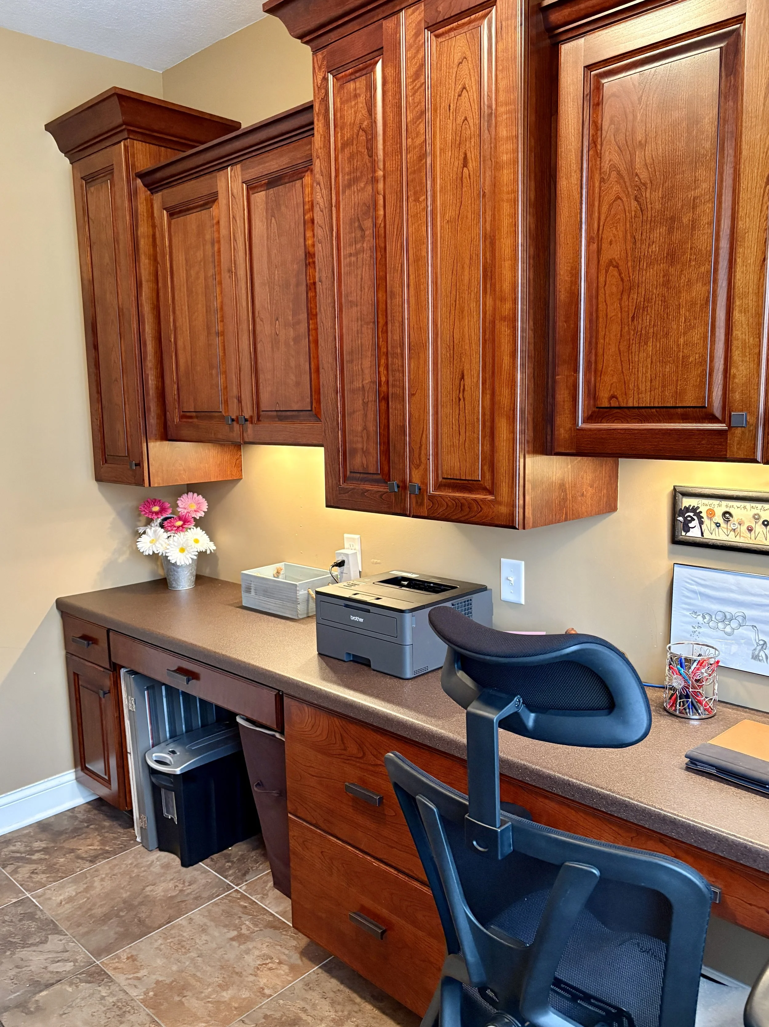 Organized office area with neat cabinetry, labeled storage, and functional workspace with a chair and printer.