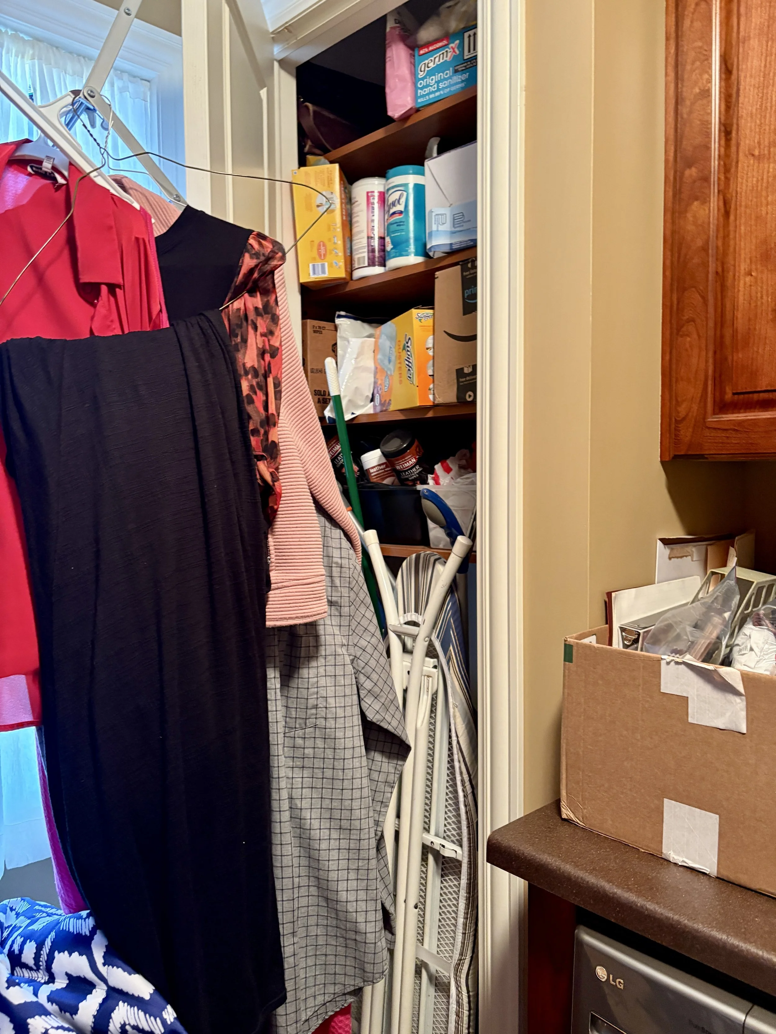Closet filled with excess supplies and hanging clothes obstructing access.