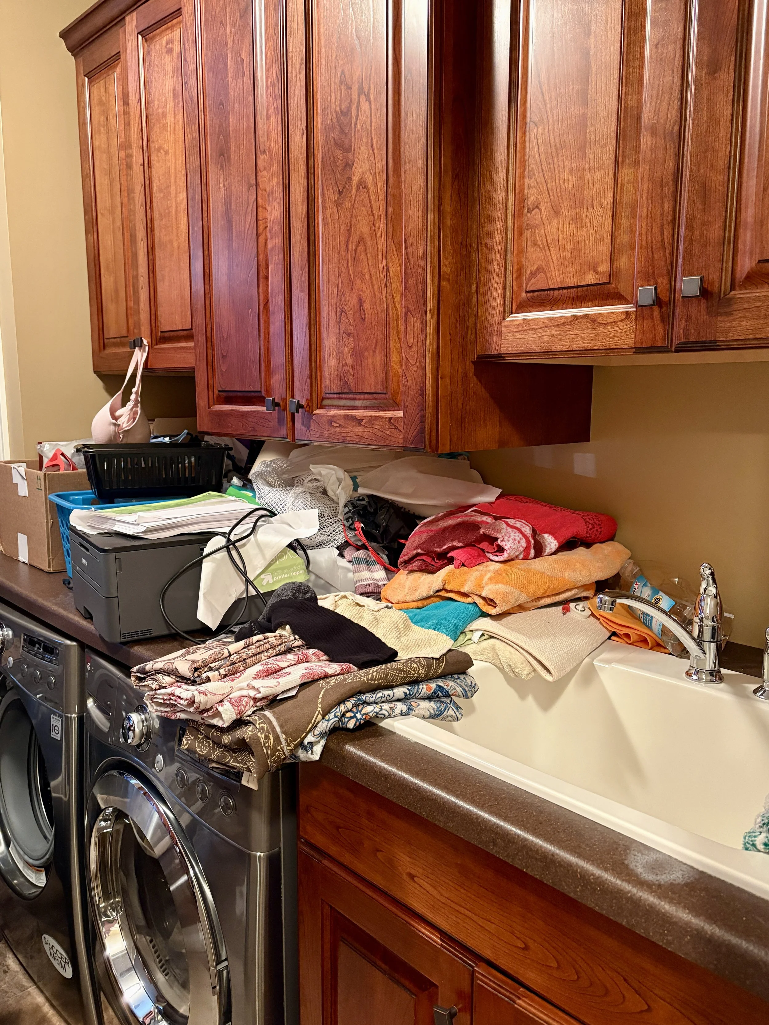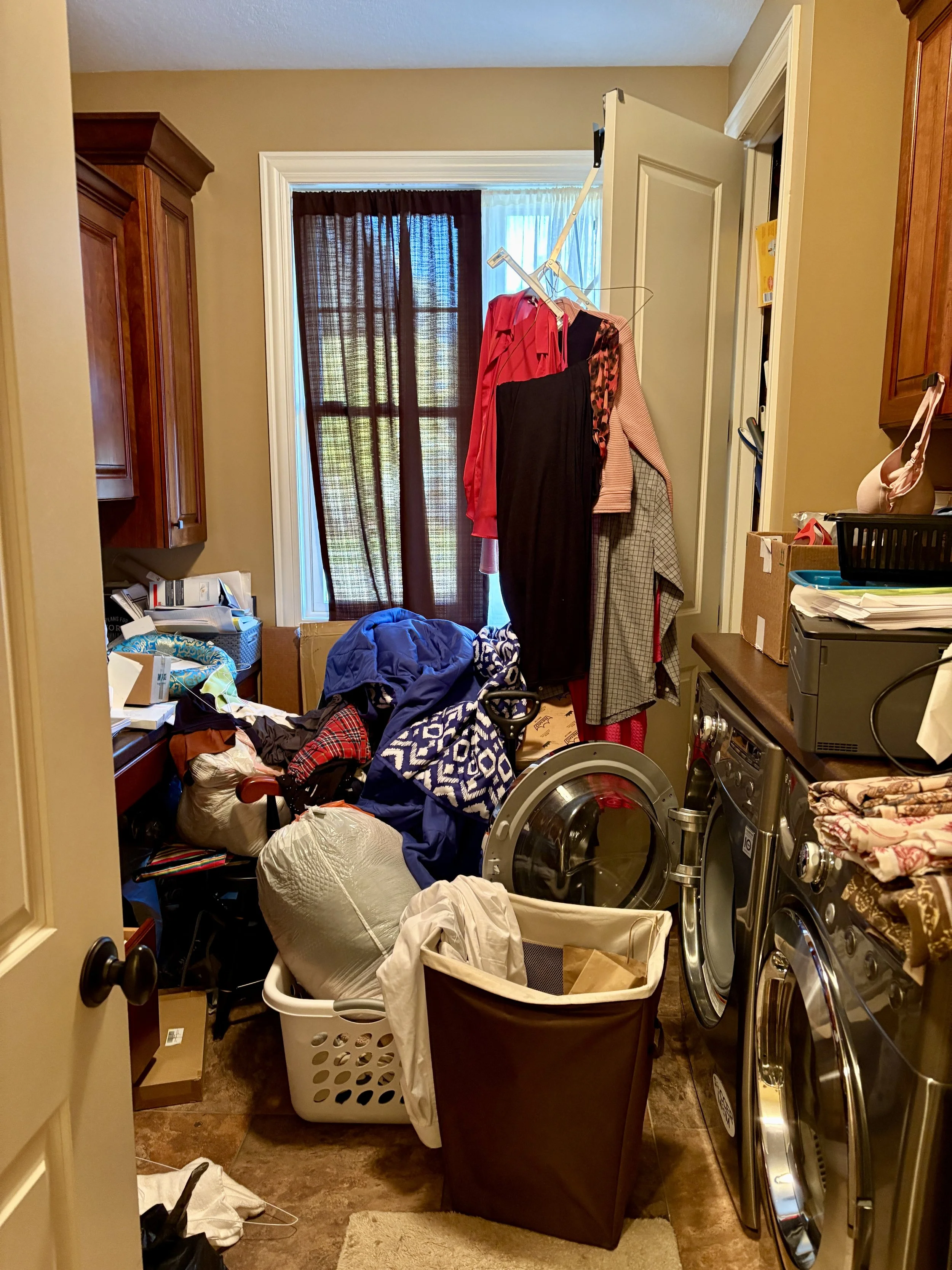 Laundry room cluttered with laundry baskets, clothes, and paperwork scattered across counters and floor.