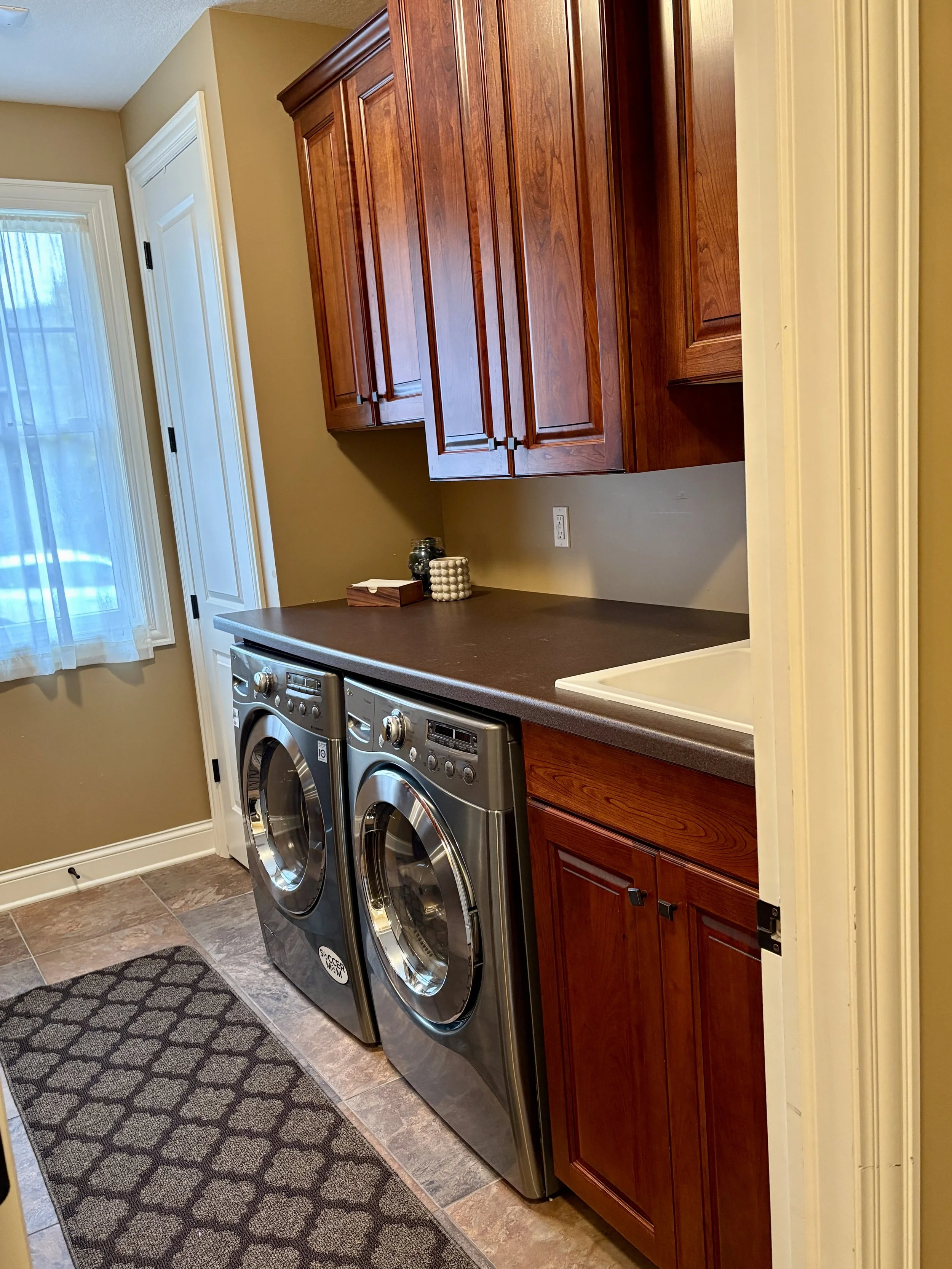 Clean, organized laundry space with clear counters, tidy cabinets, and washer/dryer area ready for daily use.