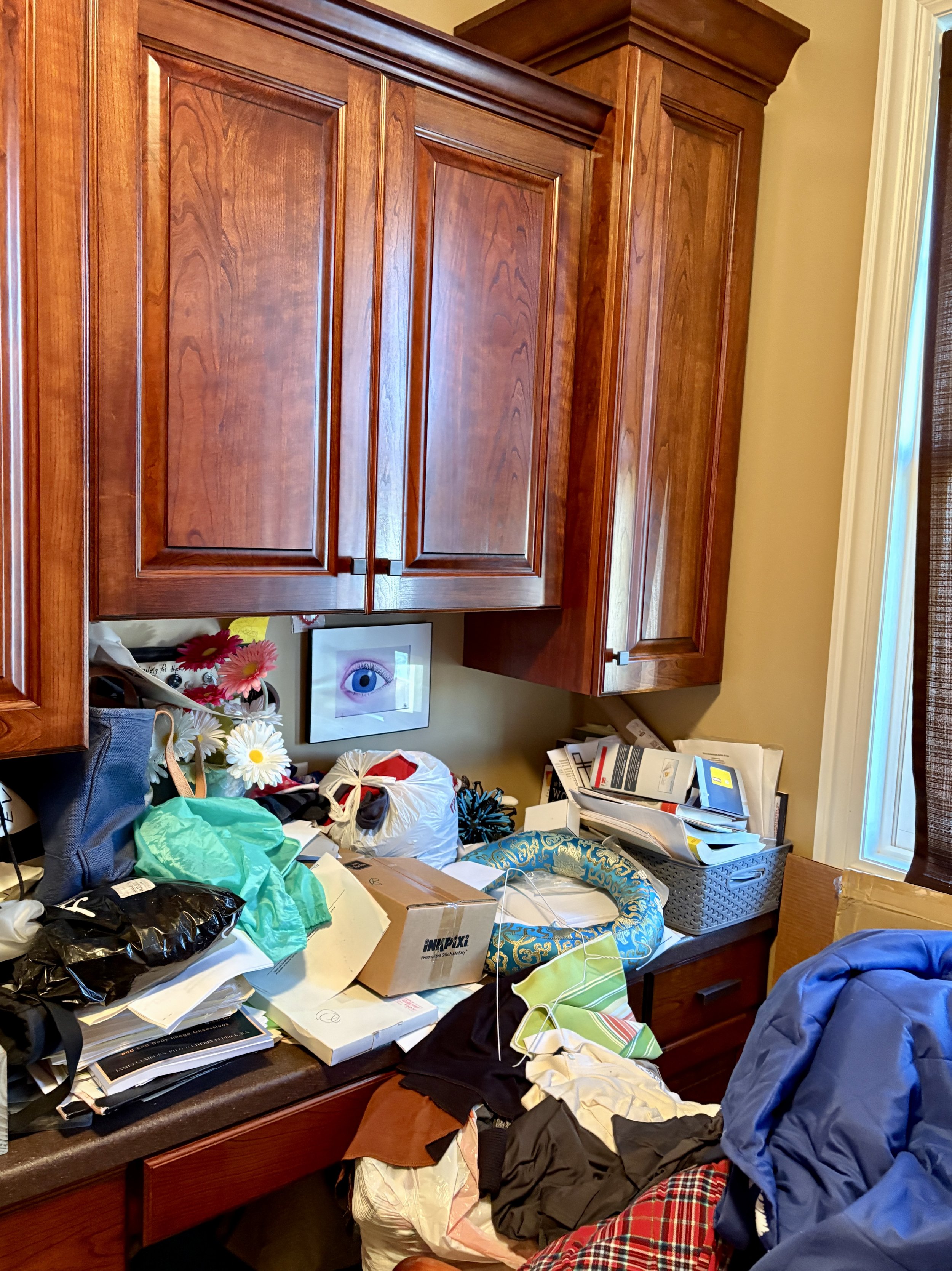 Office corner overflowing with paper clutter, boxes, and miscellaneous items on every surface.