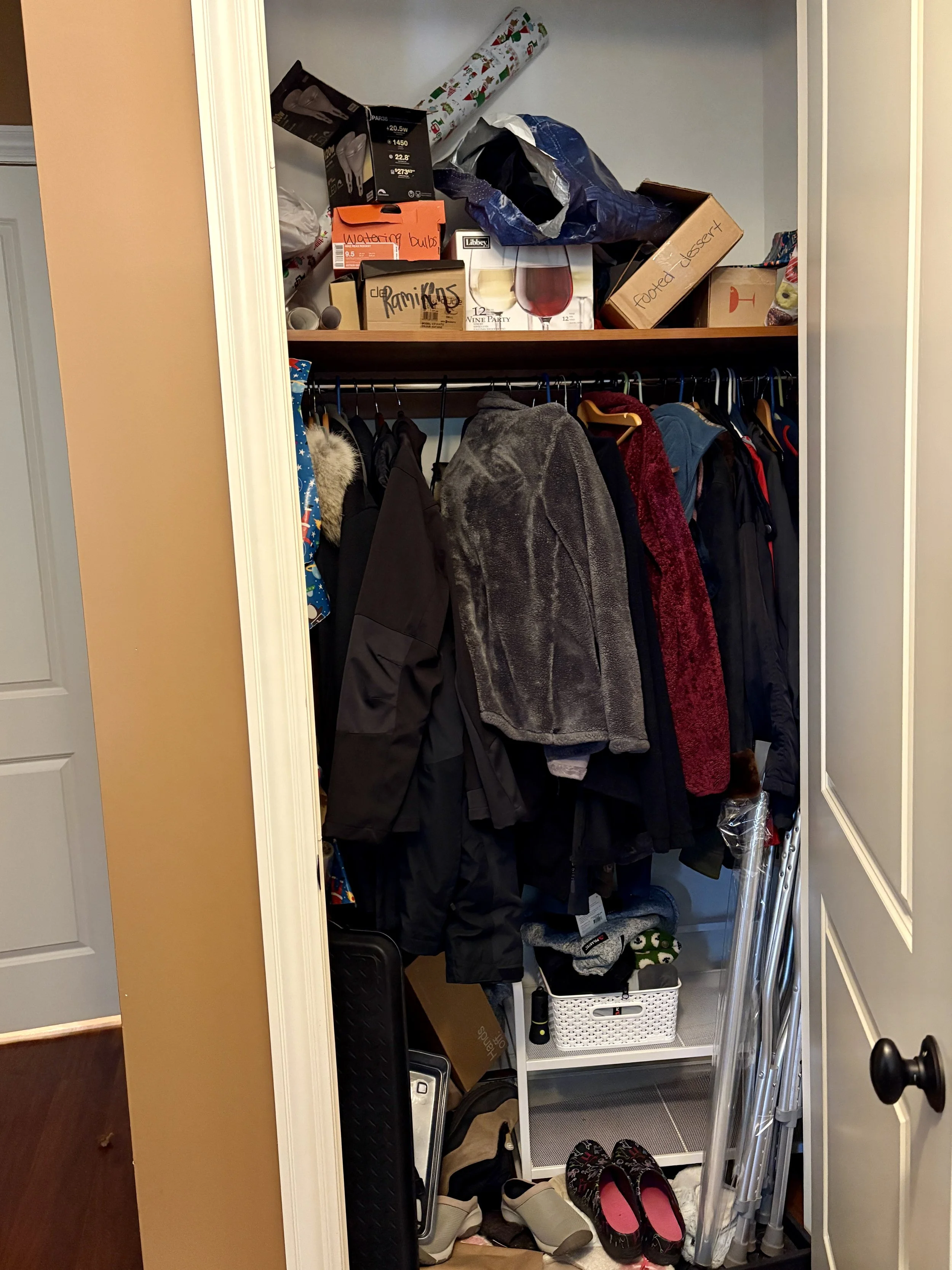 Foyer closet before organization — crowded hanging space with excess shoes and boxes.